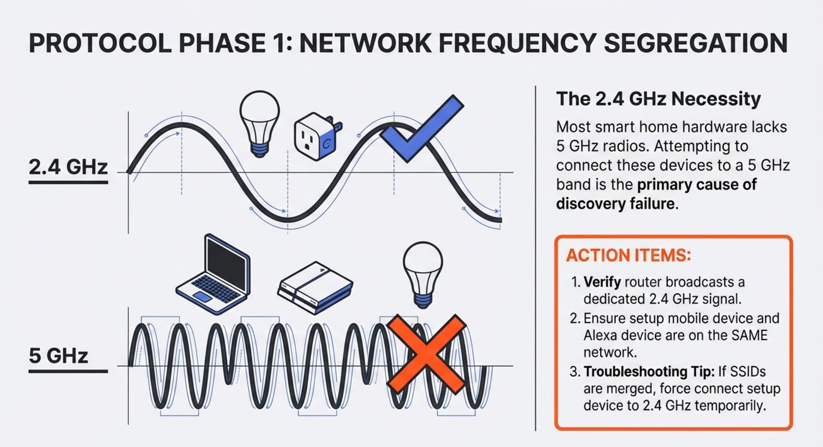 • Most Alexa discovery fails happen because devices are on different Wi-Fi or using the wrong frequency band.