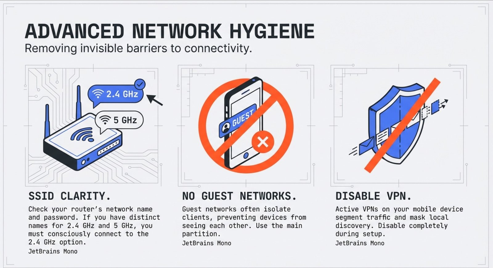 Step 1: Confirm Power + Same Wi-Fi Network (2.4 GHz First)