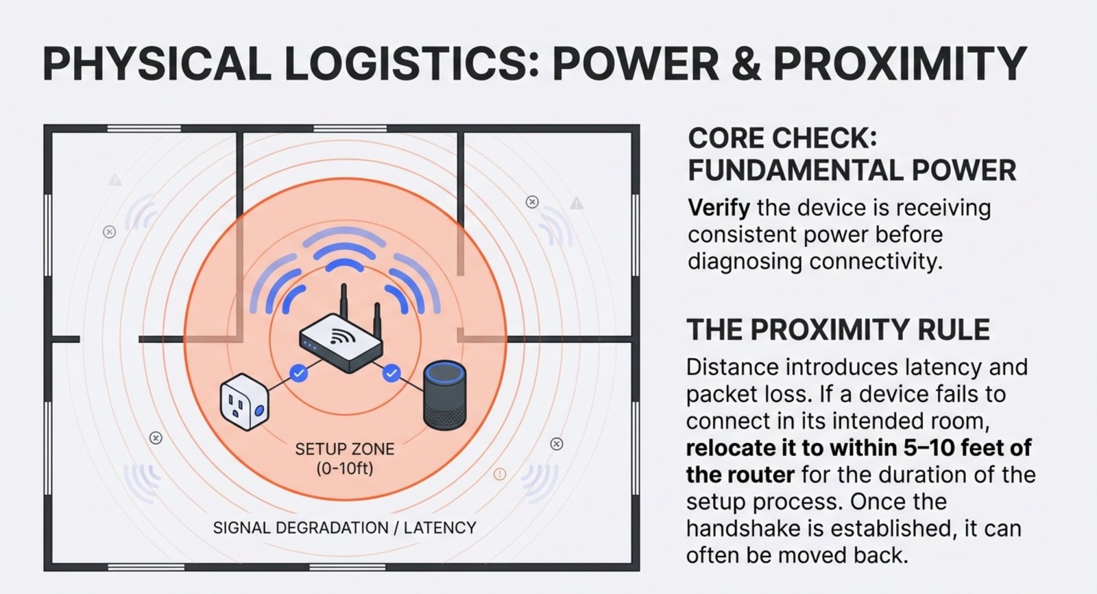 And here’s something people don’t always realize: distance actually matters—a lot. If the device is far from the router/Echo—or behind thick walls or metal appliances—signal quality can drop enough that discovery fails.