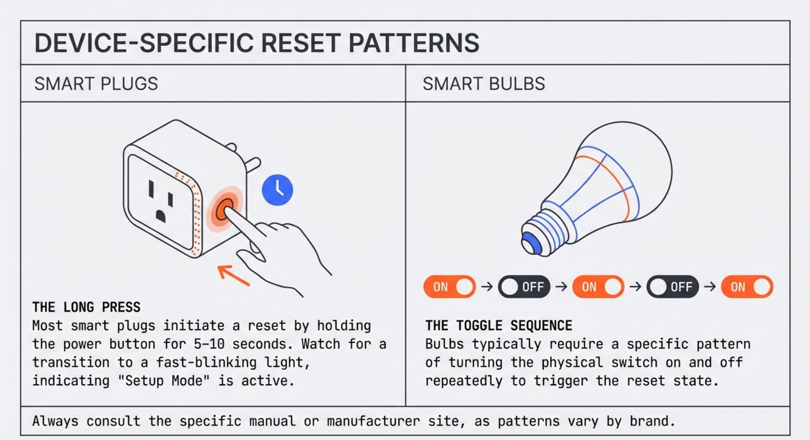 Resetting smart devices depends on the brand. Most plugs want you to hold the power button for 5-10 seconds until the light blinks fast. Bulbs usually need to be turned on and off a certain way. Check the manual or manufacturer’s site for the exact steps.