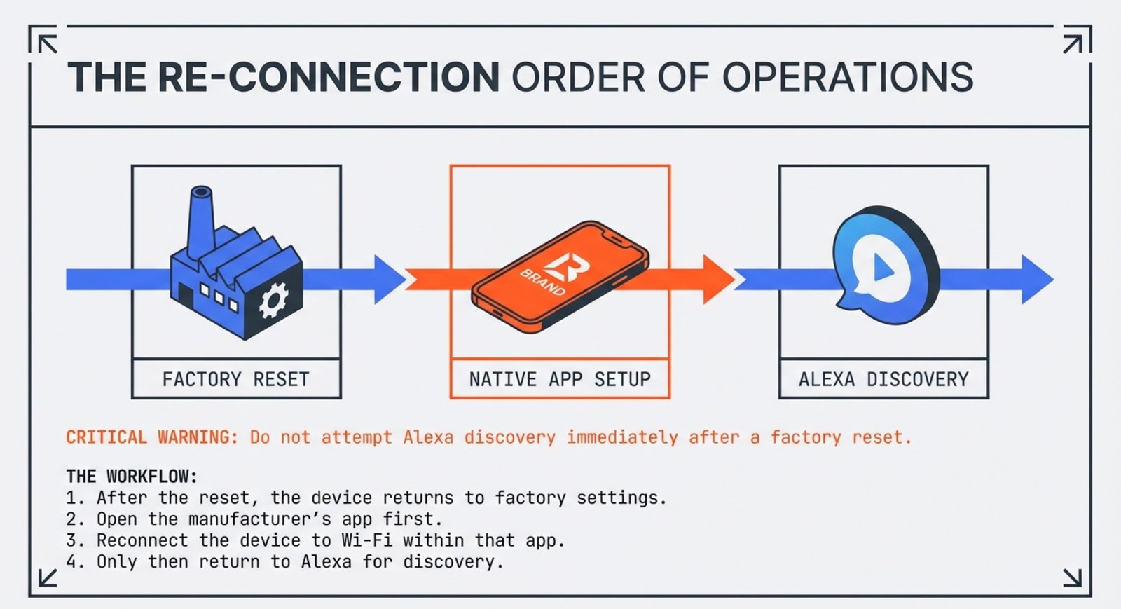 After a reset, your device is in setup mode again. Reconnect it to Wi-Fi in the manufacturer’s app before trying Alexa discovery.