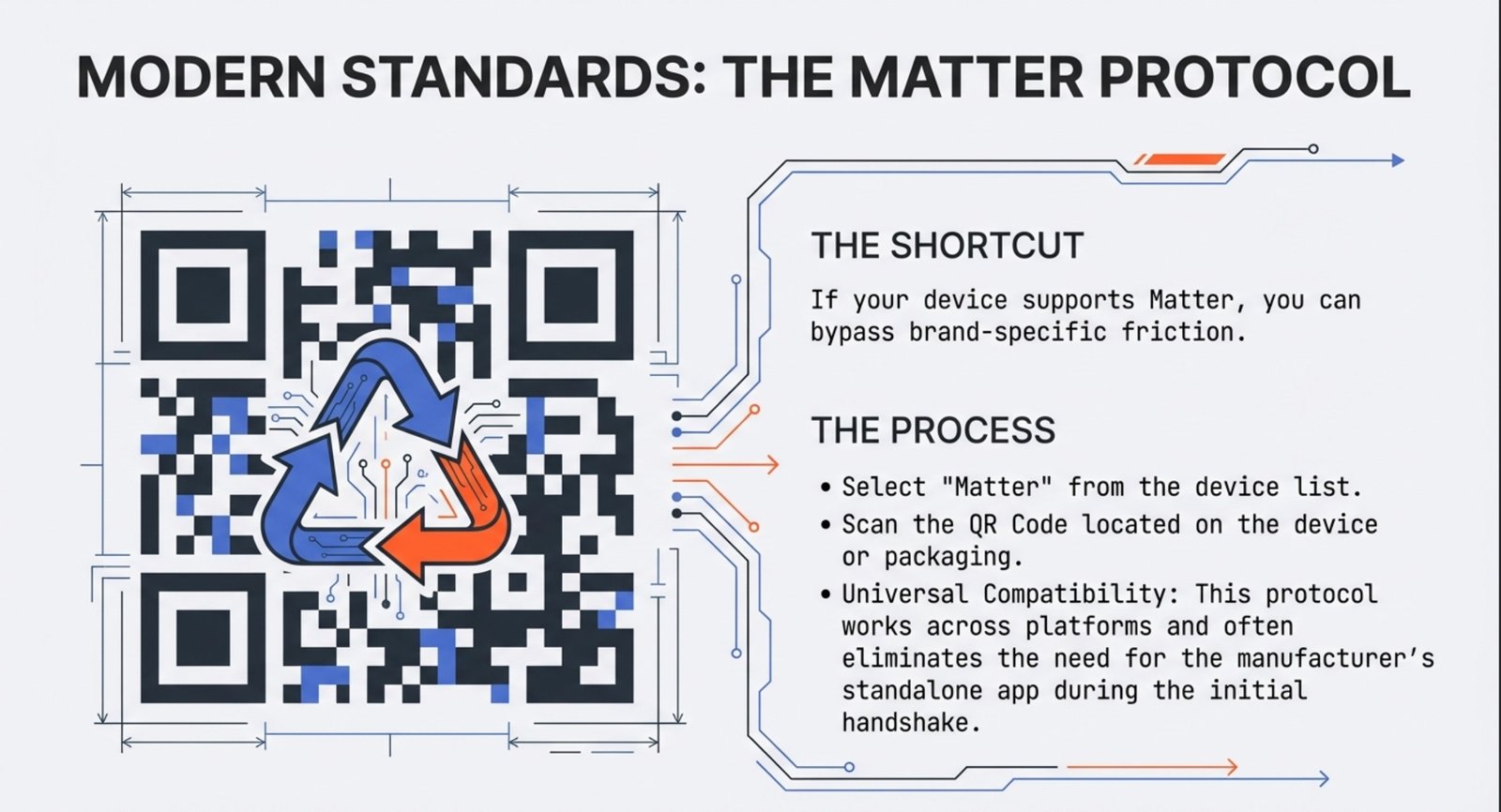 If your device supports Matter, pick Matter and scan the QR code on the device or box. This process works across different platforms, often without needing the manufacturer’s app.