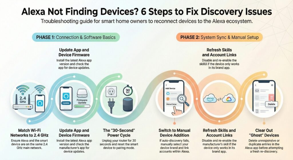 If Alexa not finding devices on wifi happens even though everything is online, the issue is often network behavior rather than “internet down”—guest network isolation, device isolation, mesh nodes/subnets, or discovery signals not passing correctly. Your fix path is Step 1–3, especially “same network,” then restart order.