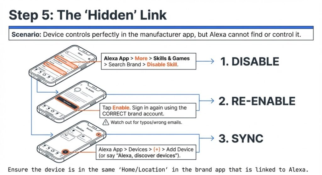 This is one of the most common causes behind Alexa cant find smart devices. The device is connected and controllable in the manufacturer app, but Alexa doesn’t pull it in because the skill is disabled, linked to the wrong account, or stuck on an old authorization. Your fix path here is Step 5 (Skills + Account Linking)—not more Wi-Fi resets.