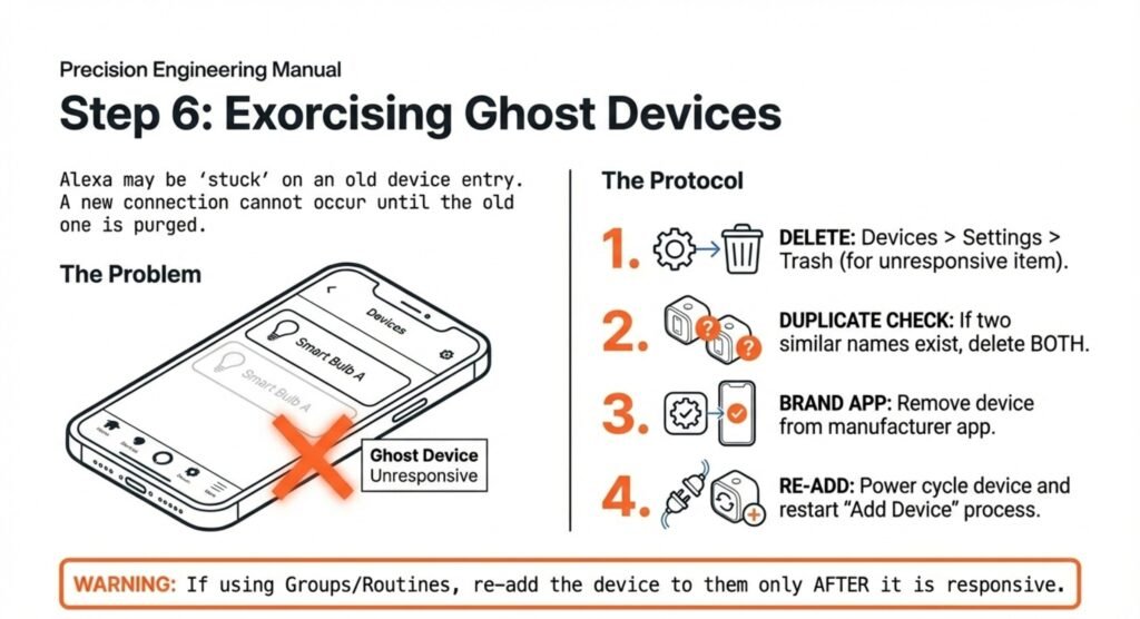 Sometimes Alexa device discovery not working isn’t about your new device at all—Alexa is stuck on an old entry (duplicates, renamed devices, devices you removed months ago). That’s when you see “unresponsive” devices or a smart device not showing in alexa app even after repeated scans. Your fix path is Step 6 (Remove Ghost Devices, Then Re-Discover).