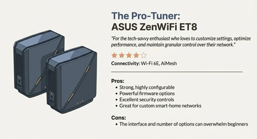 | ASUS ZenWiFi ET8 | Wi-Fi 6E, AiMesh, advanced controls | Tech-savvy users & privacy-focused setups | ★★★★☆ Strong, highly configurable |