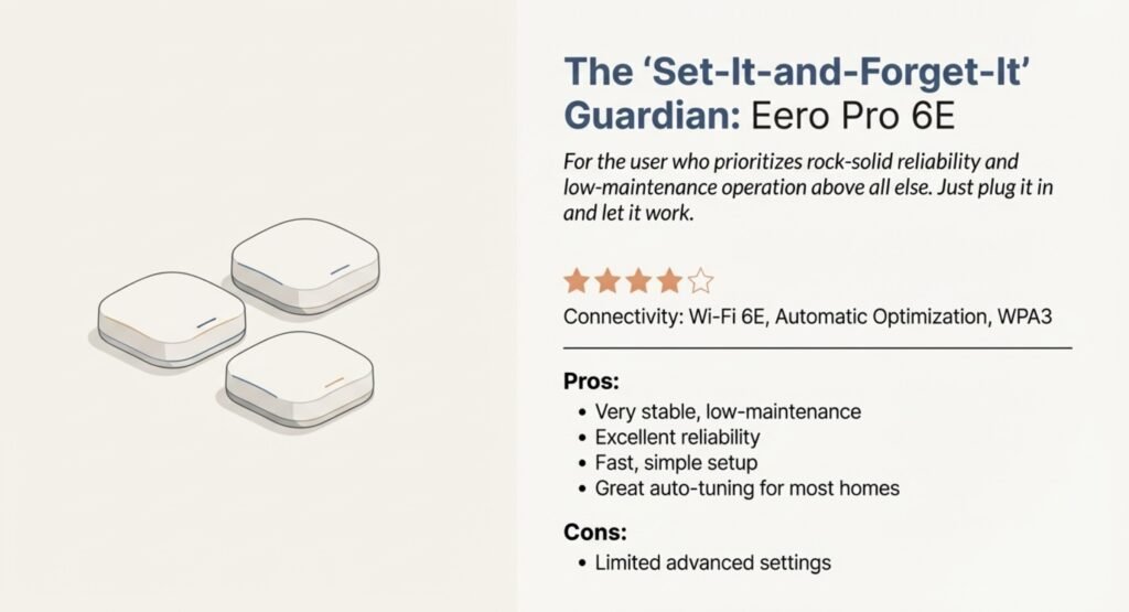 | Eero Pro 6E | Wi-Fi 6E, automatic optimization, WPA3 | Hands-off setup seekers | ★★★★☆ Very stable, low-maintenance |