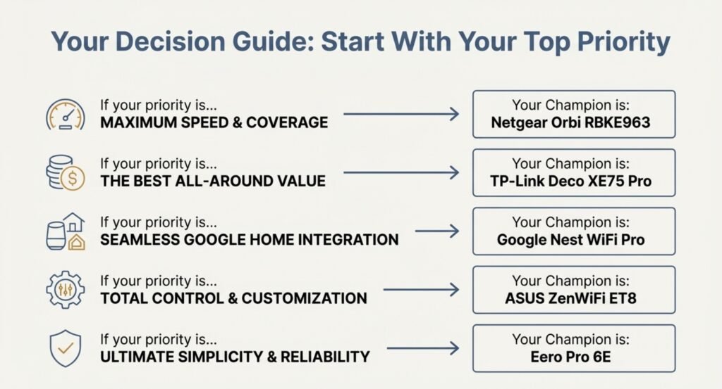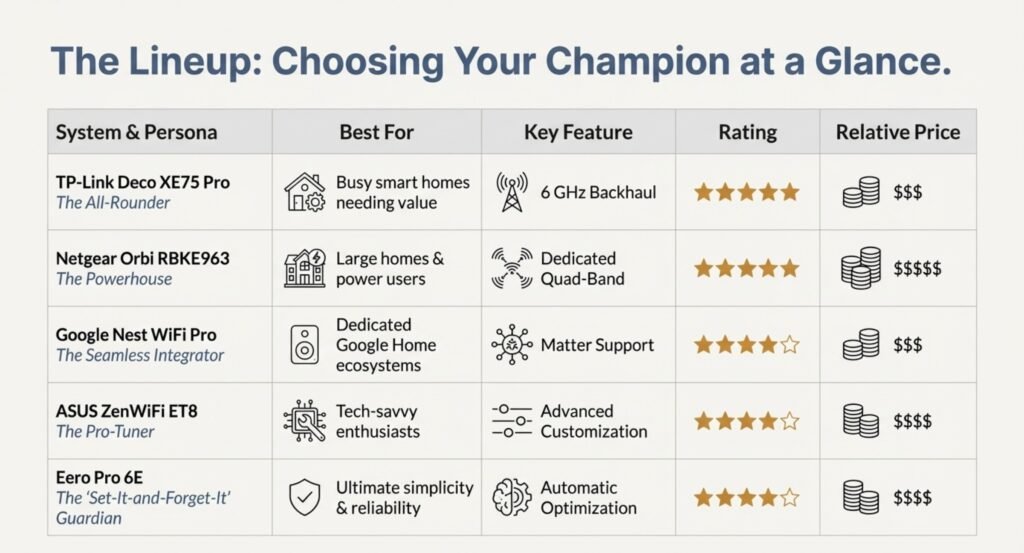 | Netgear Orbi RBKE963 | Wi-Fi 6E, quad-band, dedicated backhaul | Large homes & power users | ★★★★★ Extremely fast & consistent |