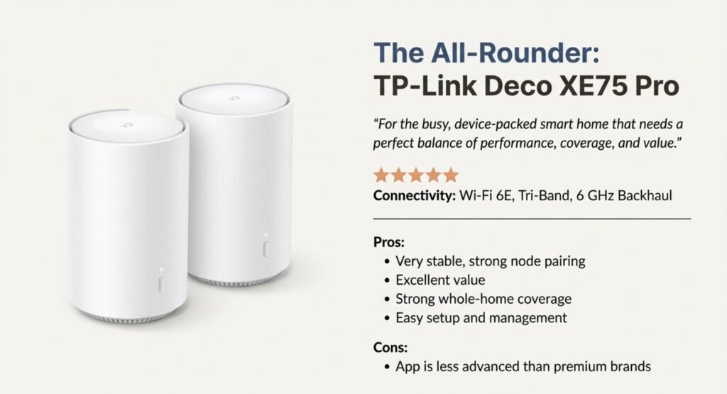 | TP-Link Deco XE75 Pro | Wi-Fi 6E, tri-band, 6 GHz backhaul, WPA3 | Smart homes with many devices | ★★★★★ Very stable, strong node pairing |