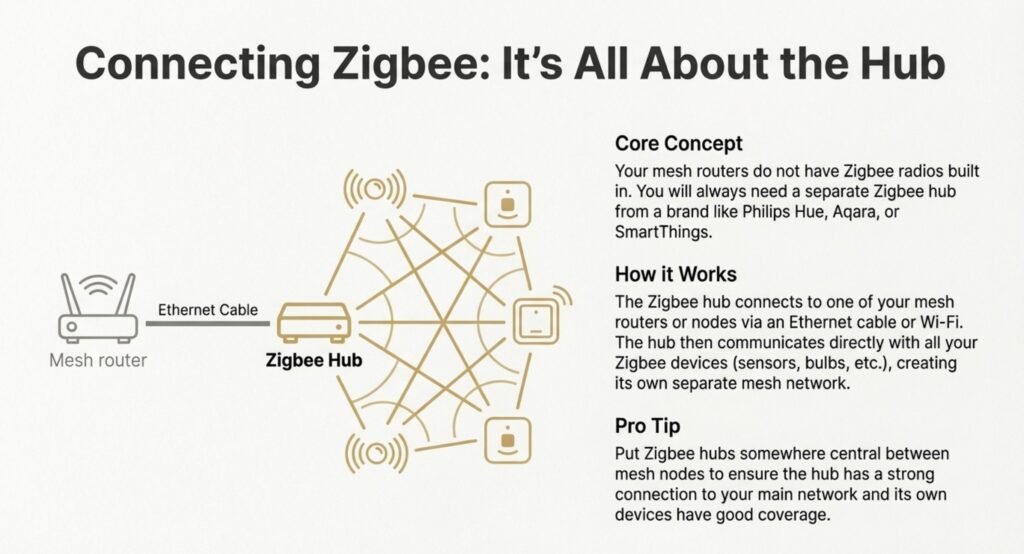 Zigbee devices need their own hub—mesh routers don’t have Zigbee radios built in. The hub connects to your mesh by ethernet or Wi-Fi and talks to Zigbee sensors from there.