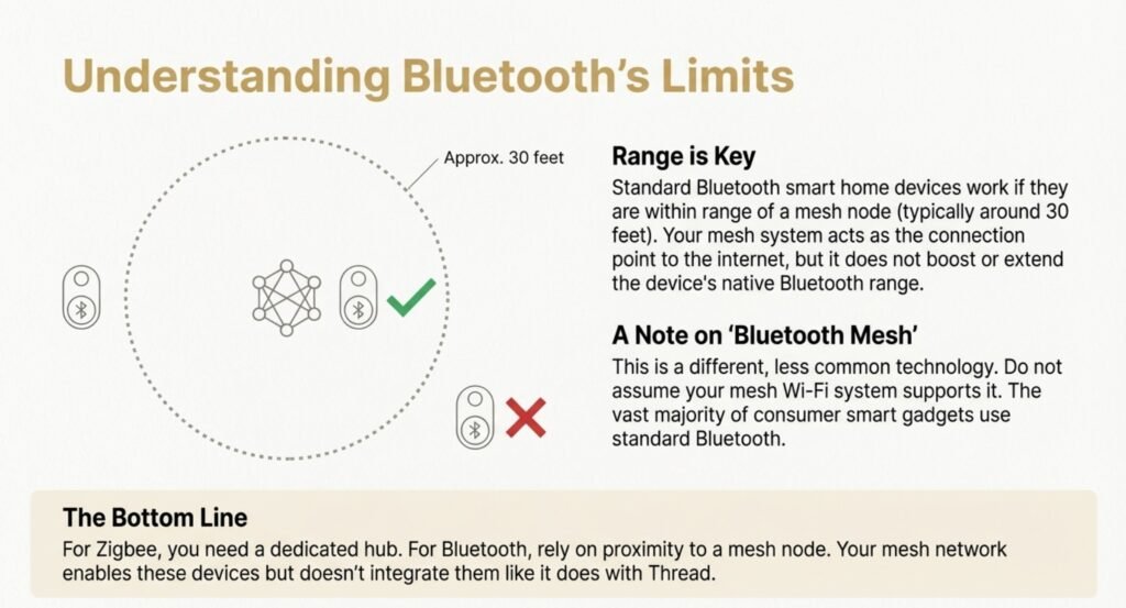 Bluetooth smart home stuff works if it’s within 30 feet of a mesh node, but don’t expect mesh to boost its range. Bluetooth mesh is a different animal, and honestly, not many consumer gadgets use it yet.