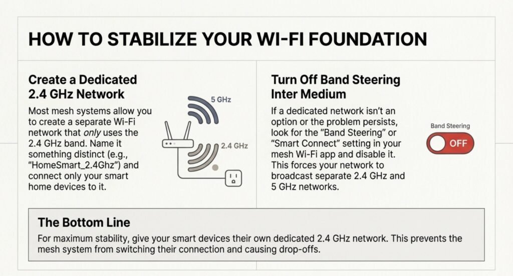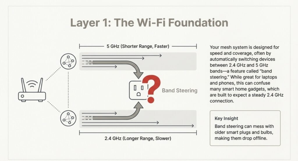Smart home gadgets on 2.4 GHz Wi-Fi usually connect better than ones stuck on 5 GHz, since mesh networks like to switch bands. Band steering can mess with older smart plugs and bulbs, making them drop offline.