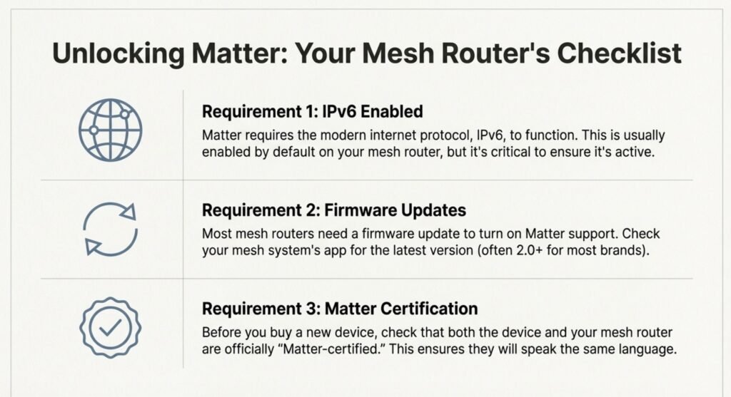 Most mesh routers need a firmware update to turn on Matter support. Always check the app for Matter certification before buying new smart devices—it’s easy to overlook.