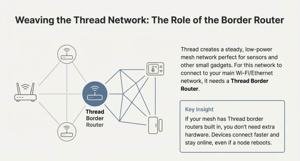 If your mesh has Thread border routers built in, you don’t need extra hardware. Devices connect faster and stay online, even if a node reboots.