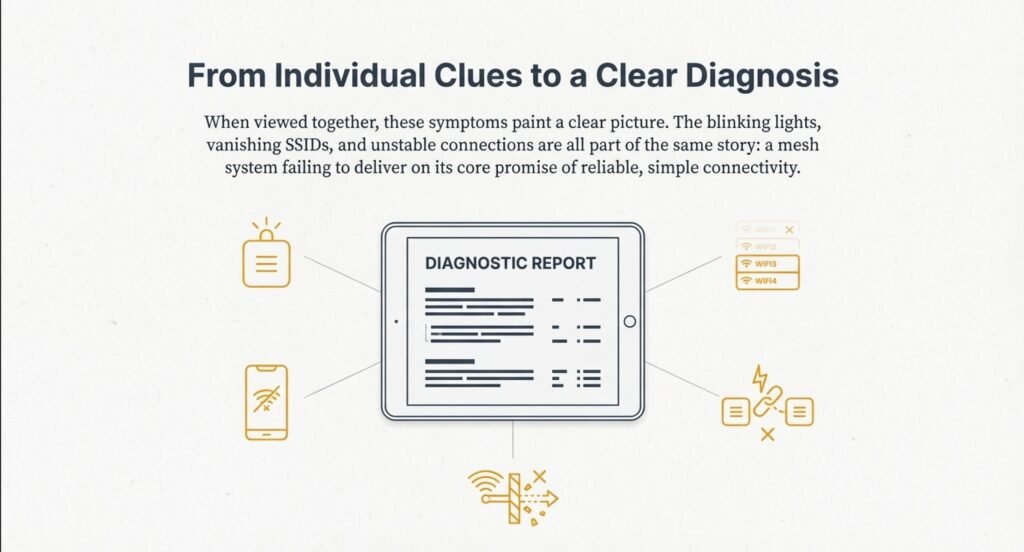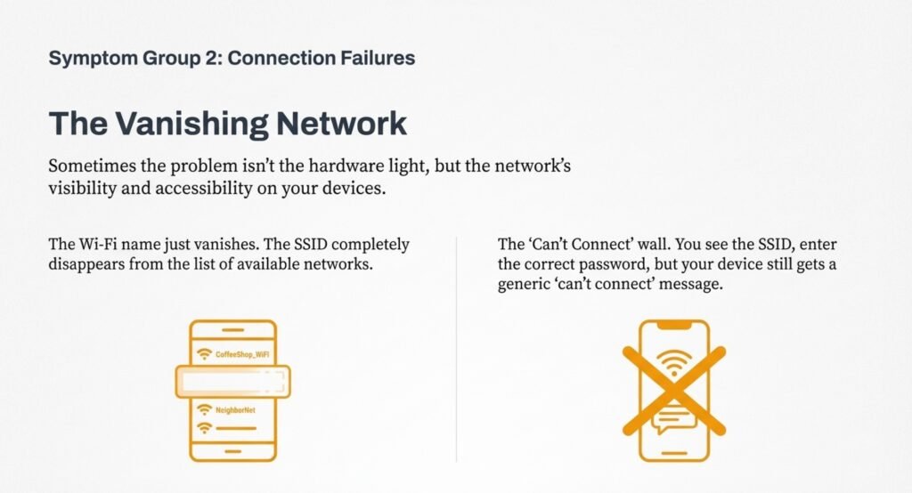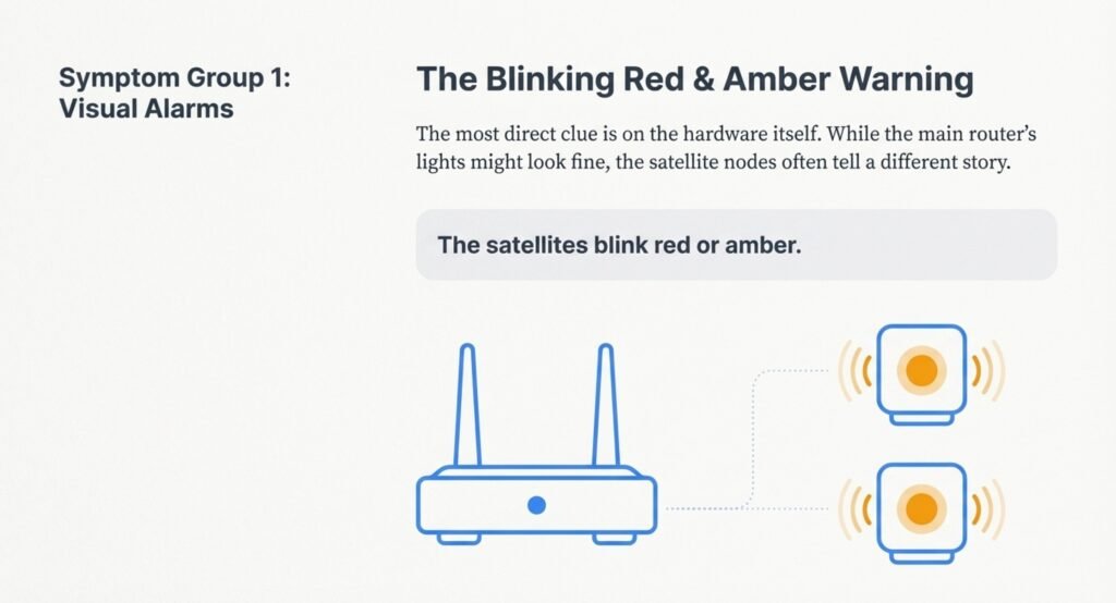 Sometimes the main router’s lights look fine, but the satellites blink red or amber. Or the Wi-Fi name just vanishes from the list. Even if you see the SSID and type the password, you might get a “can’t connect” message.