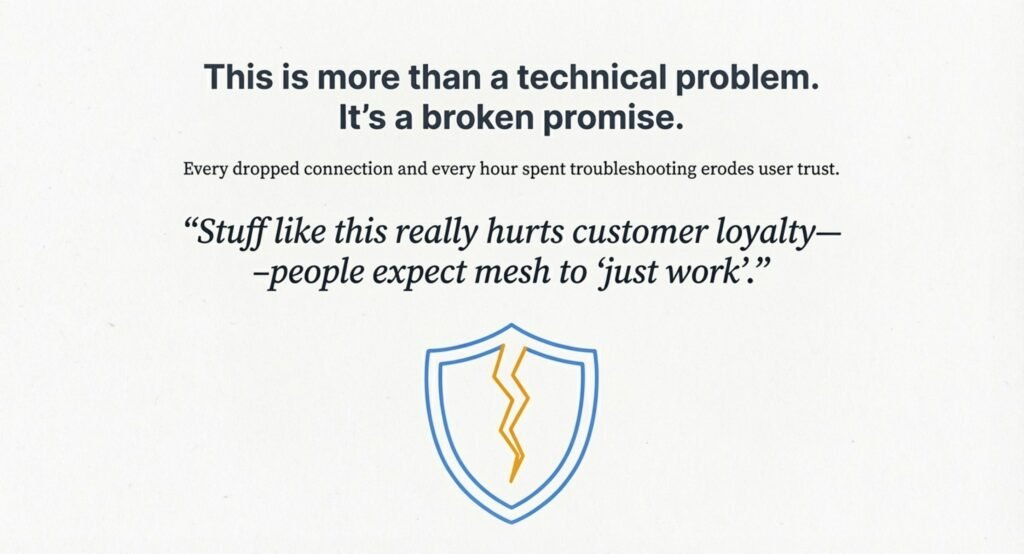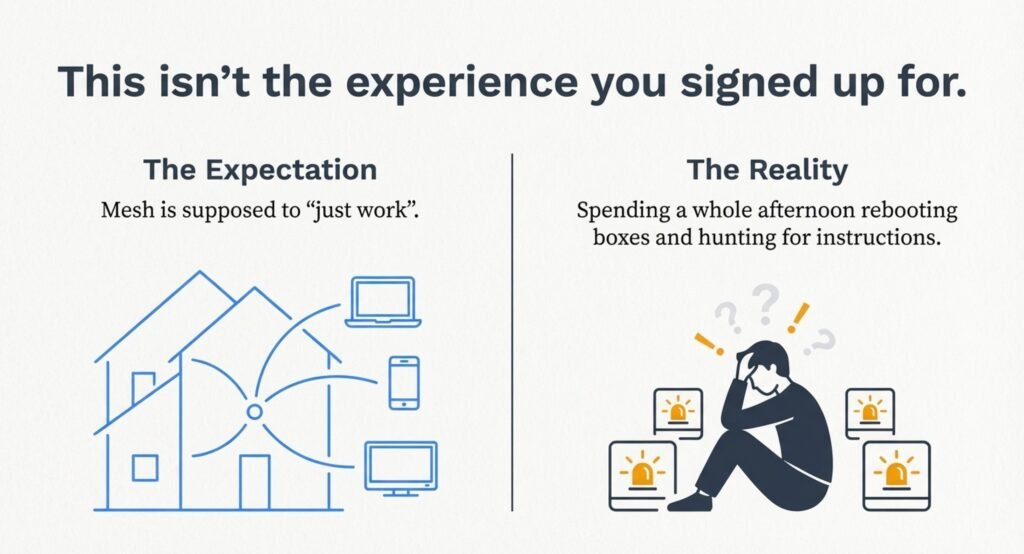 Stuff like this really hurts customer loyalty—people expect mesh to “just work,” not to spend a whole afternoon rebooting boxes and hunting for instructions.