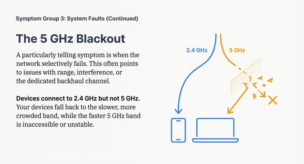poor node placement, outdated firmware, or band steering conflicts with smart devices.