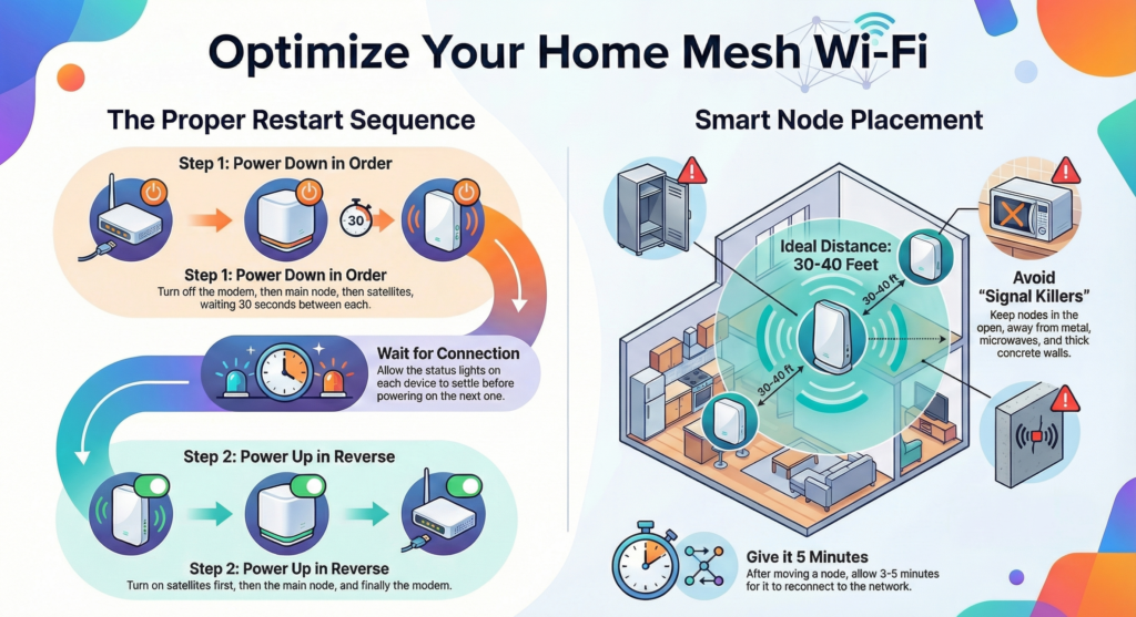 If mesh WiFi not connecting after this, move to placement and firmware next — those two solve most cases.