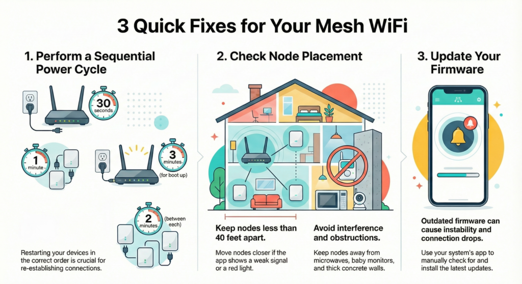 If mesh WiFi not connecting right now, start with these three fixes in order before you change advanced settings.