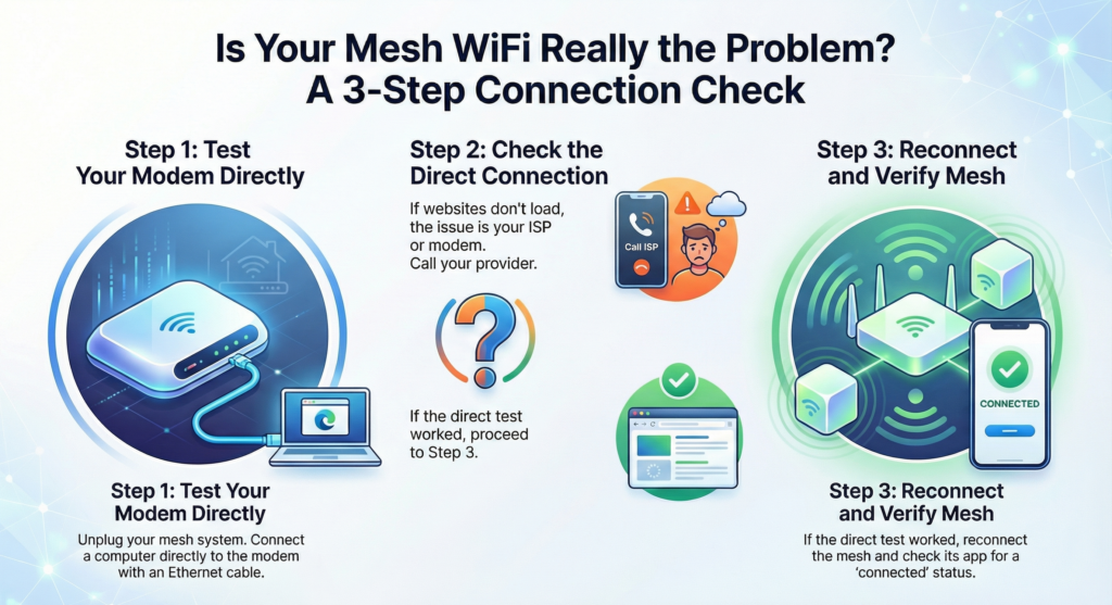 Mesh systems can’t fix a broken ISP connection. Always test the modem before blaming your mesh. A surprising number of mesh WiFi not connecting reports are actually ISP or modem issues, not the mesh system itself.