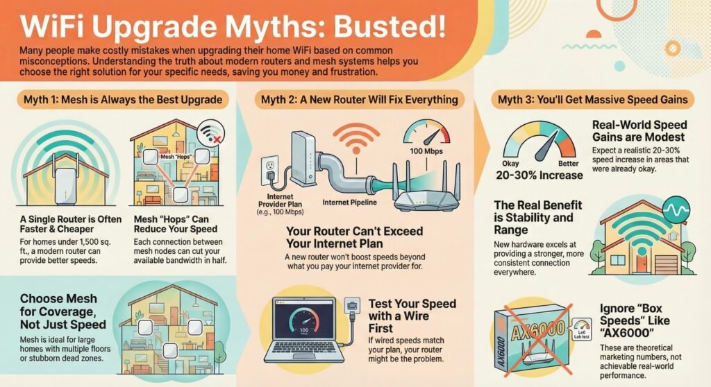 Reality: Mesh is best for coverage problems (dead zones). A strong router upgrade often wins in small homes for speed/value.