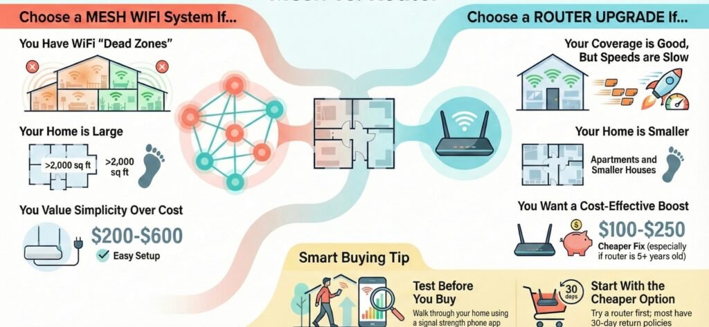 If coverage is good everywhere but WiFi is slow, try a router upgrade first. If you have dead zones in multiple rooms, mesh is usually the faster fix.