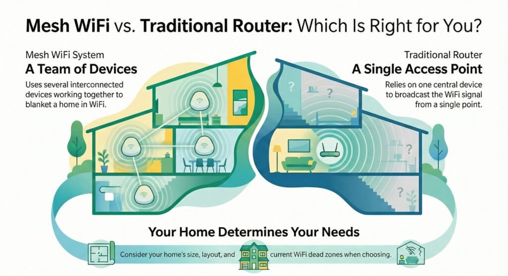 Mesh WiFi systems use several devices working together, while traditional routers are just a single access point. What’s best really depends on your home’s size, layout, and the problems you’re facing.