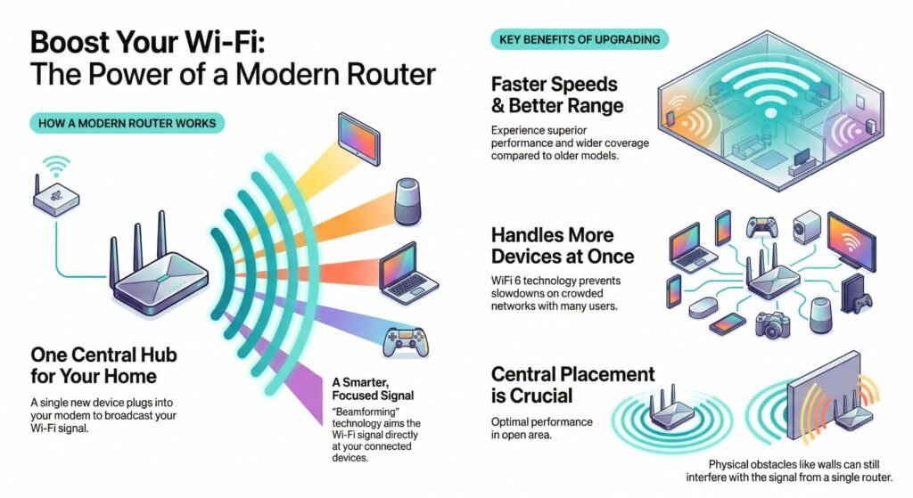 Router upgrades mean swapping your old router for a newer, stronger one. It stays in one place, but gives you better speed and range than before.