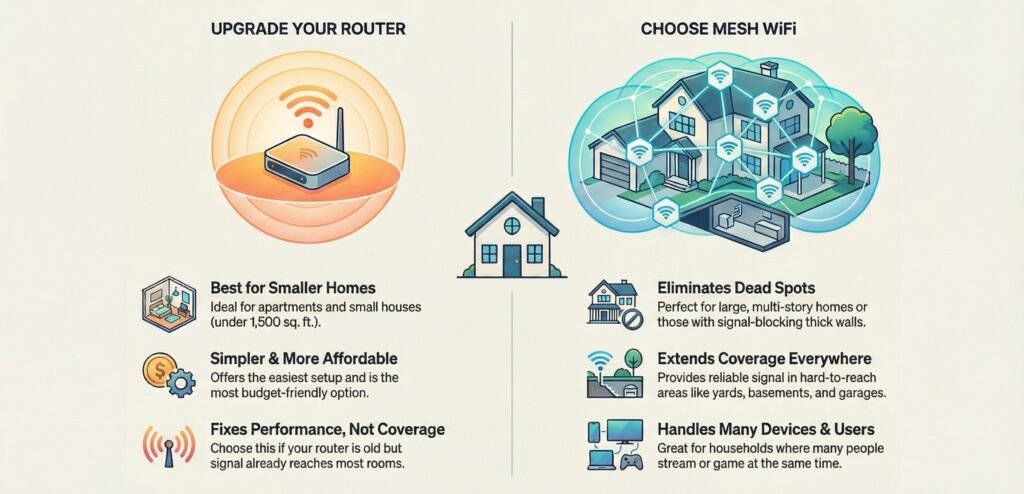 Decision in one line: Mesh fixes coverage gaps across rooms. A router upgrade fixes performance issues from one central spot.
