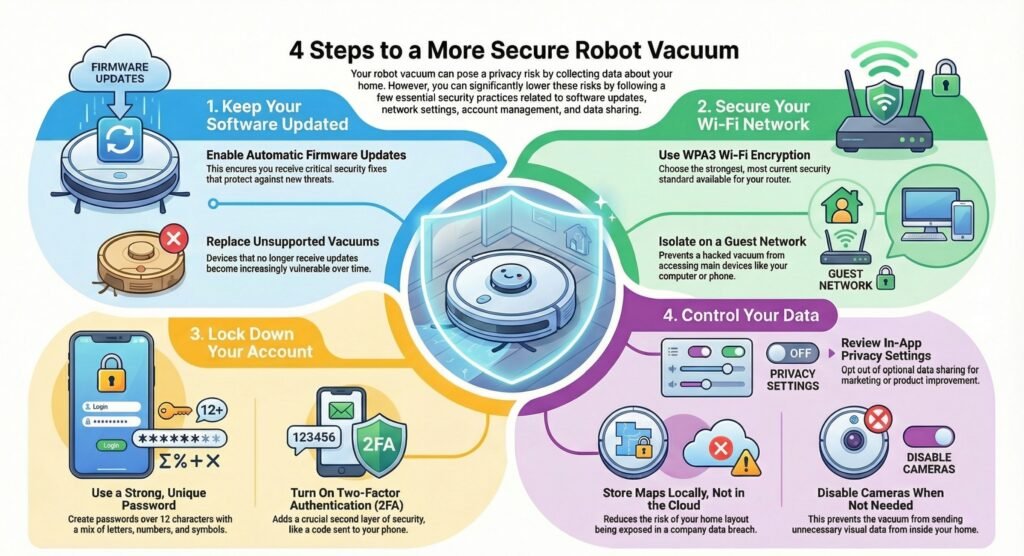 To improve robot vacuum data security, use strong unique passwords, isolate devices on a guest network, keep firmware updated, and disable unnecessary cloud features or cameras.