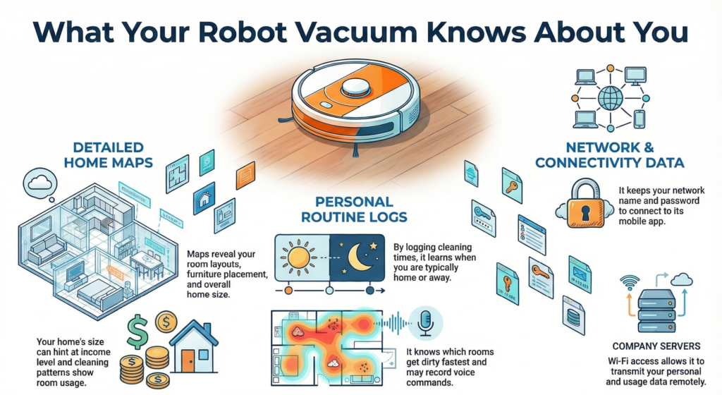 Your vacuum logs cleaning schedules, so it knows when you’re likely home or gone. It tracks which rooms get dirty fastest. Some models even record voice commands if you use Alexa or Google Assistant to start them.