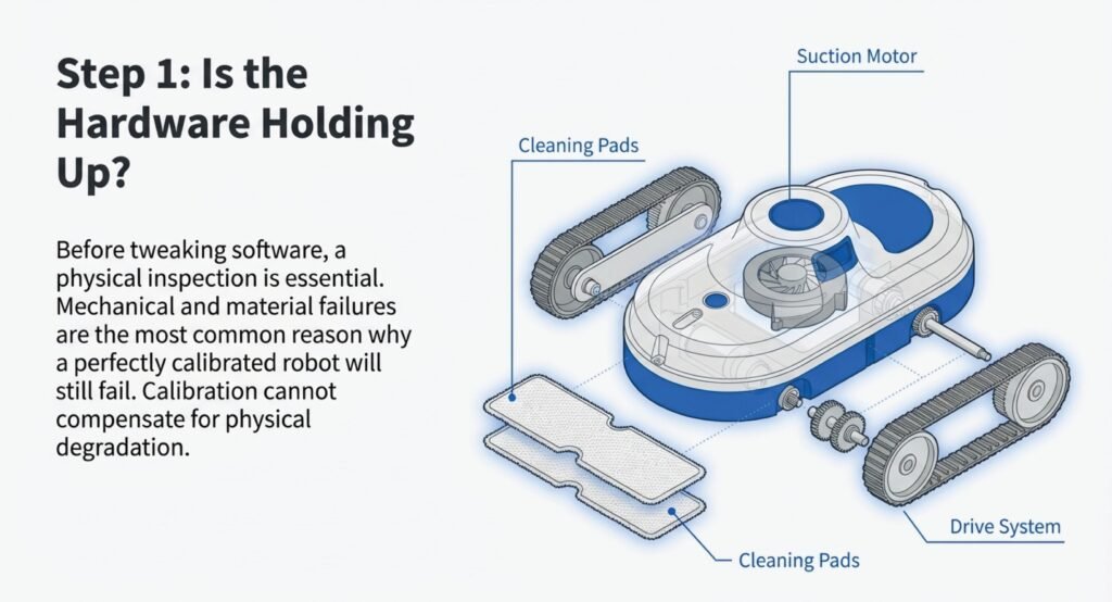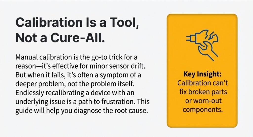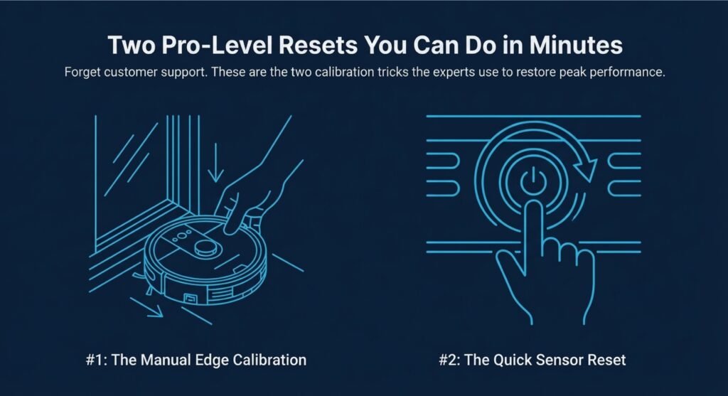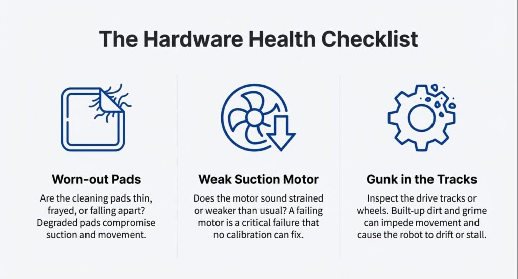 Manual calibration tweaks are fine for minor sensor drift, but they can’t fix broken parts or worn-out components. If the pads are falling apart, the suction motor is weak, or there’s gunk in the tracks, recalibrating won’t help at all.