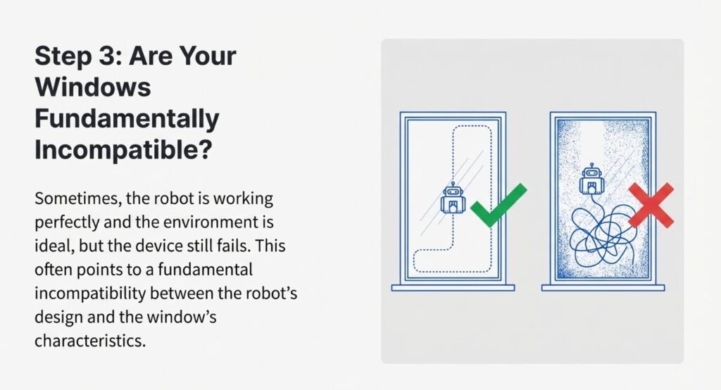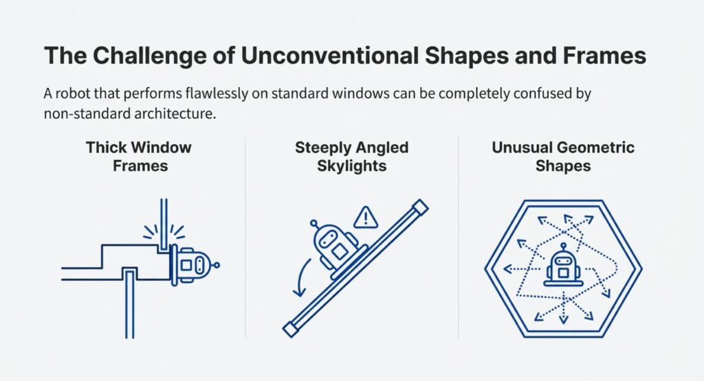 Odd window shapes and thick frames can also cause trouble. A robot that works fine on regular home windows might get confused by commercial glass or skylights set at a steep angle.