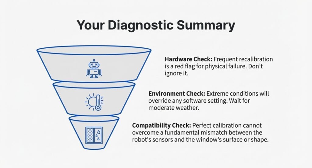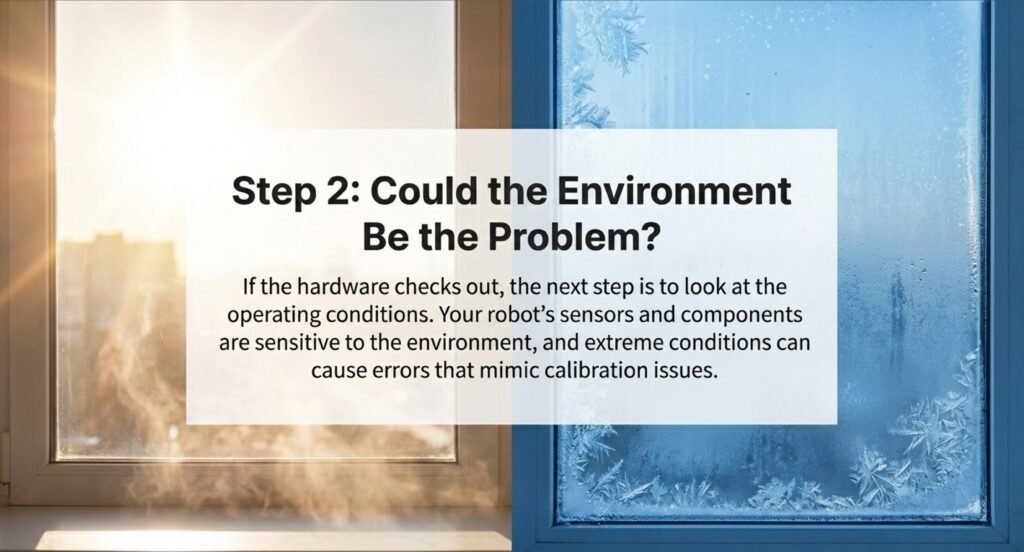Wait for temps above 50°F and humidity under 70% before calibrating. If there’s condensation, dry the window and the robot sensors with a cloth first.
