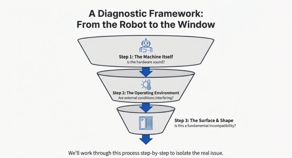 First, take a look at the window for any obstacles—stuff like stickers, leftover tape, or maybe even bird droppings. Robots tend to get confused by these things and will often stop to figure out what’s going on.