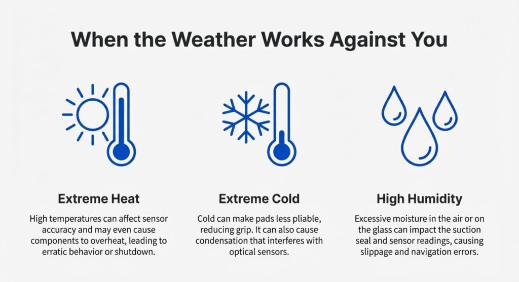 Temperature swings also mess with calibration. A robot set up in winter might struggle in summer, since glass can expand a little. Humidity can throw off suction, which messes up tracking and makes the robot stop or slide.