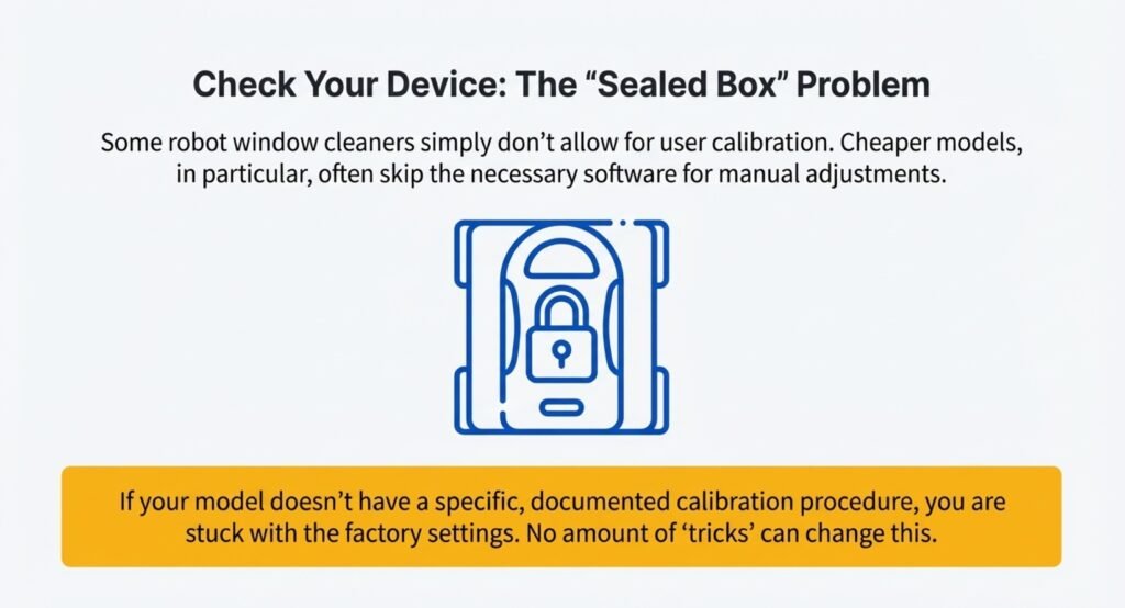 Some robot window cleaners don’t let users calibrate them at all. Cheaper models often skip the software needed for manual adjustments, so you’re stuck with whatever the factory set up.
