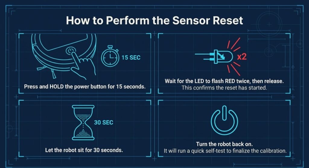 Hold down the power button for 15 seconds. Wait for the LED to flash red twice. Let go, wait 30 seconds, then turn the robot back on. It’ll usually run a self-test and refresh its calibration data in under a minute.