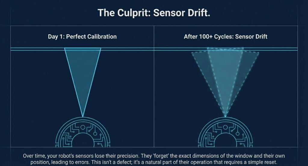 Use this sensor reset whenever the robot starts acting up, or after you move it to a window that’s a different size or surface type. It’s one of the fastest ways to fix robot window cleaner calibration problems.