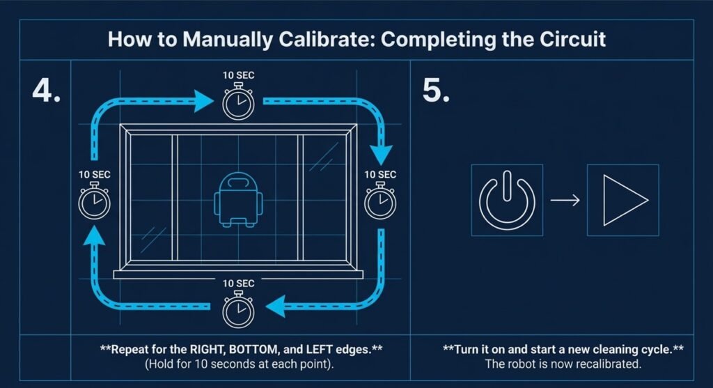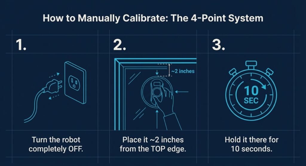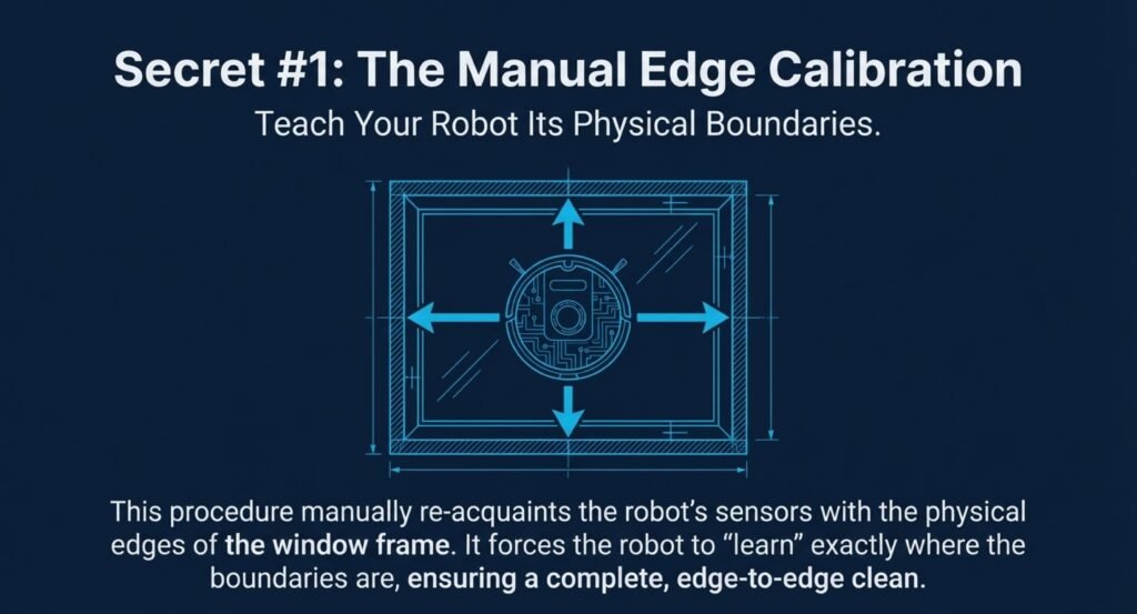 The trick? With the robot powered off, place it about 2 inches from each window edge and hold it there for 10 seconds. That’s how it “learns” where the boundaries are and refreshes its edge calibration.