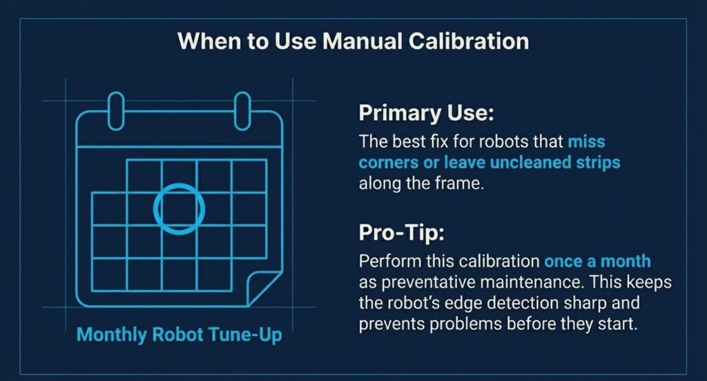 Most people skip this after first setup, but doing it once a month keeps the robot from missing corners, stopping partway through, or leaving uncleaned strips along the frame.
