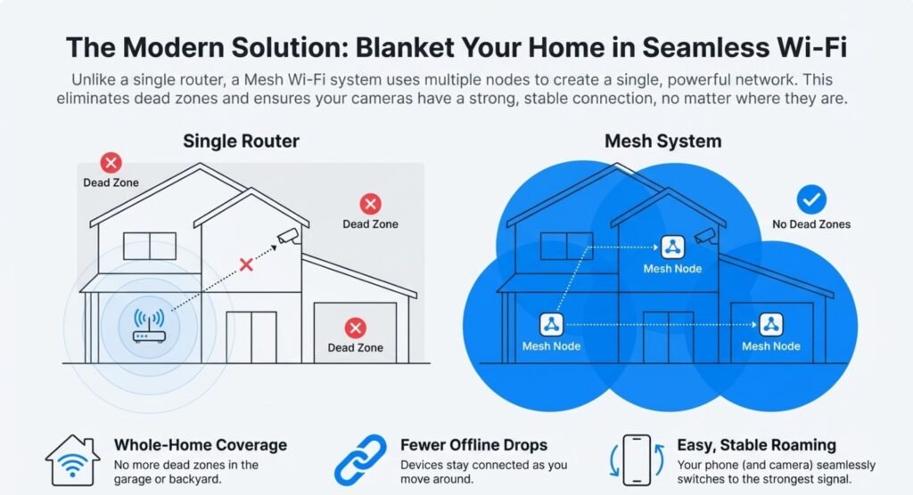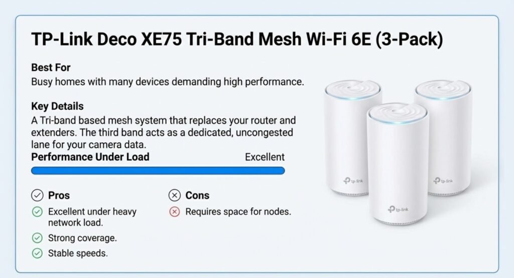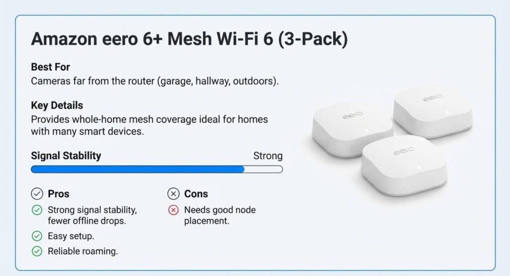 wifi problem not loading wont connect | Whole-home mesh coverage for many smart devices. | Cameras far from router (garage, hallway, outdoors). | Strong signal stability, fewer offline drops. | Easy setup, reliable roaming. | Needs good node placement. | Check Price |