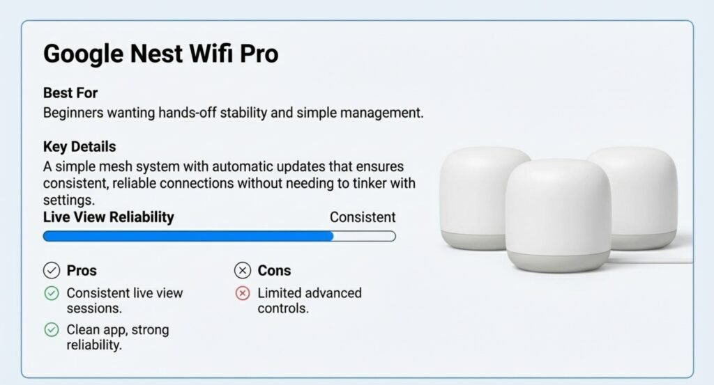 wifi problem stopped working | Simple mesh system with automatic updates. | Beginners wanting hands-off stability. | Consistent live view sessions. | Clean app, strong reliability. | Limited advanced controls. | Check Price |
