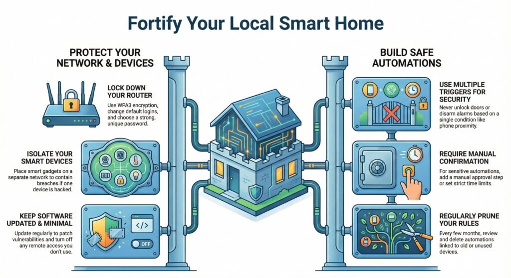 Use a strong router password, keep firmware updated, and disable remote features you don’t use—simple steps that help protect smart home network without cloud dependence becoming a risk.