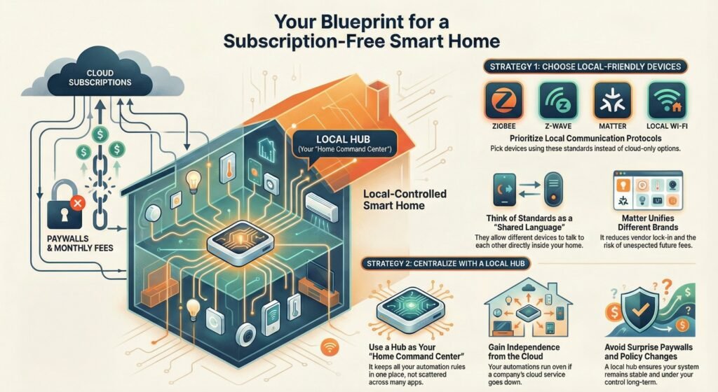 You avoid subscriptions by picking devices that use local protocols instead of cloud-only options. Popular choices are Zigbee, Z-Wave, Matter, and local Wi‑Fi control. These let devices talk inside your home, not through paid servers.