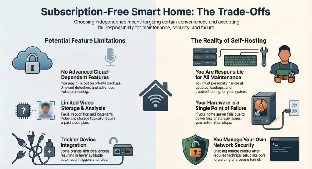 Subscription-free automation is usually more stable and private because more of your rules and data stay at home. The downside is convenience: remote control, cloud notifications, and “smart” camera features can be limited unless you configure them yourself. If you value routines that keep working during outages and fewer accounts to manage, local control is often the better long-term fit.
