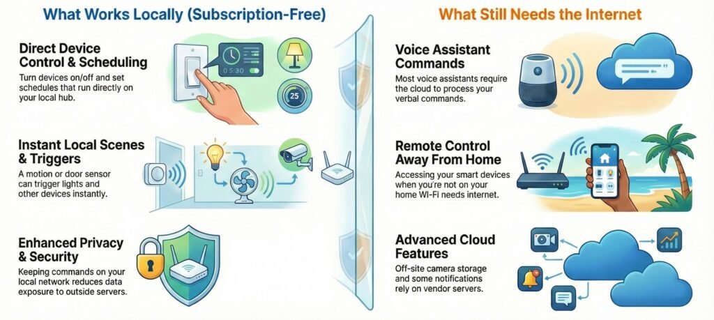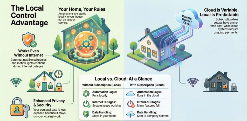 It means your core routines (schedules, sensor triggers, scenes) run locally, so you’re not paying monthly fees just to keep basic automation working.