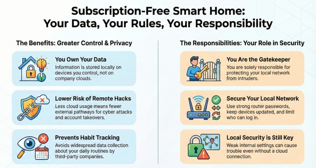 Going subscription-free changes where your data lives, and subscription free smart home privacy and security usually improves when less information leaves your home.