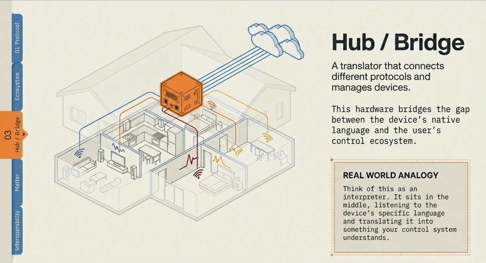 - Hub / Bridge: A translator that connects different protocols and manages devices.