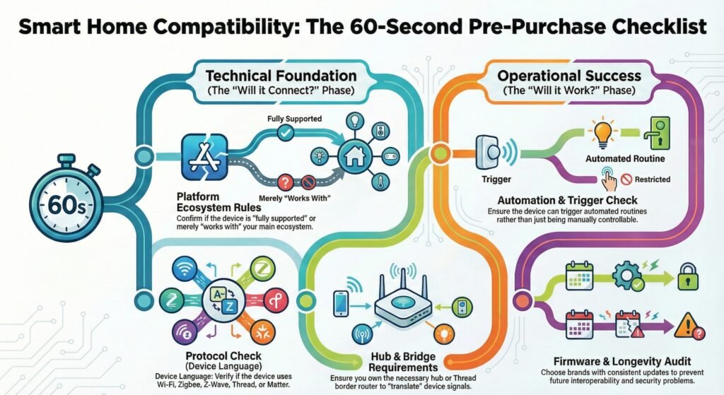Before you buy or pair a new gadget, run this 60-second check. It prevents most smart home compatibility issues and reduces the “it works in its app but not in my routines” headache.